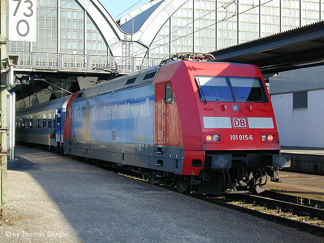 101 015 "Milch" Teilbeklebung IR2560/2563 Stuttgart-Nürnberg am 10.02.2001 in Karlsruhe Hbf.