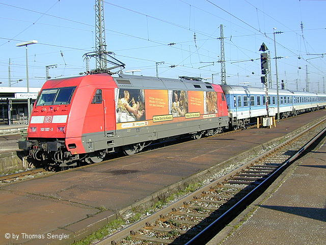 101 107 "Kinder" Teilbeklebung mit IR nach Stuttgart am 10.02.2001 in Karlsruhe Hbf.